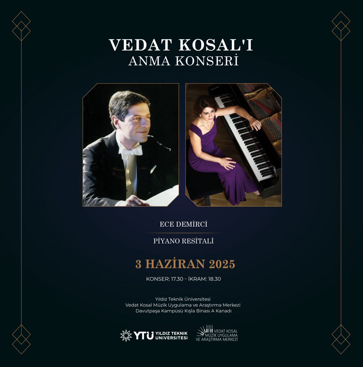Ünlü piyano virtüözü ve besteci Vedat Kosal, aramızdan ayrılışının 24. yılında özel bir konserle anılıyor. Uzun bir aradan sonra ilk kez Kosal’ın kendi piyanosunda, onun kitaplarıyla çevrili ortamda gerçekleşecek bu anlamlı etkinlik, 3 Haziran 2025 Salı günü saat 17.30’da, Yıldız Teknik Üniversitesi Vedat Kosal Müzik Uygulama ve Araştırma Merkezi'nde gerçekleşecek.